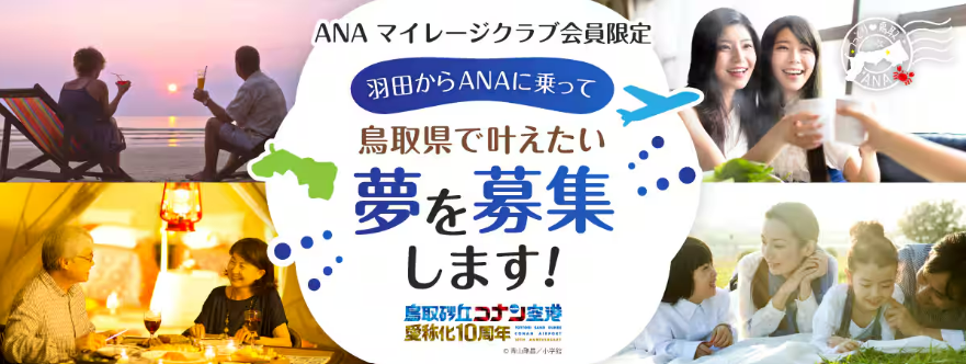 羽田空港から航空便を使って来県し、鳥取県内の行きたいところ、やりたいこと、叶えたいことなど、鳥取県で叶えたい夢を募集し、当選者の夢をANAと鳥取県が協力して叶えます。