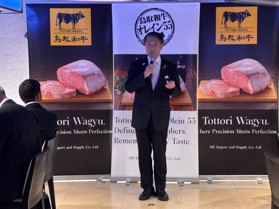・平井知事は、食パラダイス鳥取県には鳥取和牛やカニ、王秋梨など素晴らしい食材があること、ぜひタイでも多くの方にこれらの食材を味わっていただきたいこと、また、タイでも人気の名探偵コナンのセリフも引用しながら、鳥取県の食や観光の魅力をアピールした。