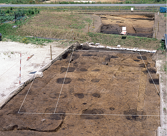 | 概 要 | 日野川下流の長者原台地(ちょうじゃばらだいち)にある遺跡群で、当時の会見郡衙(あいみぐんが:郡を治める役所)と隣接する古代寺院と考えられています。 長者屋敷遺跡には溝で区画された東西180m(南北は不明)の中に奈良時代の大きな建物が2棟並んで建てられ、坂長下屋敷遺跡では奈良時代から平安時代の役所の屋敷と思われる建物群がつくられていました。 また、坂長第6遺跡では大きな建物の他に鉄製品を作った大規模な鍛冶工房がみつかり、鍛冶炉(かじろ)に風を送るふいごの羽口(はぐち)や製作時にでる鉄の不純物が出土しました。当時、伯耆国は朝廷に税として鉄を納める国で、鍛冶工房の発見によって郡衙でも鉄生産を行っていたことが分かりました。 |