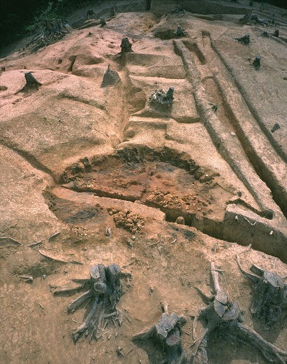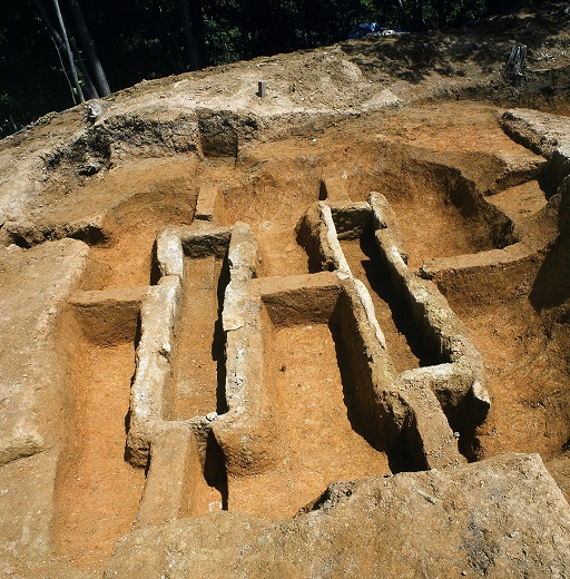 | 概 要 | 米子市の南西部にある丘陵上に位置し、弥生時代中期~平安時代の遺構、遺物が見つかっています。 弥生時代後期には丘陵上に集落が広がり、竪穴建物が9棟見つかっています。そのうち1棟は焼失住居で、土屋根構造や壁材などの復元が可能な状態でみつかっています。古墳時代には、箱式石棺(はこしきせっかん)を埋葬施設とした10基の古墳が築かれたほか、平安時代には焼かれた粘土塊が出土した土器焼成土坑(どきしょうせいどこう)や大量の土器を廃棄した跡なども見つかっており、土器の製作が行われていたようです。 |