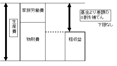補てん金の財源となる積立金は国3/4、生産者1/4(生産者積立金)の割合で基金造成する。