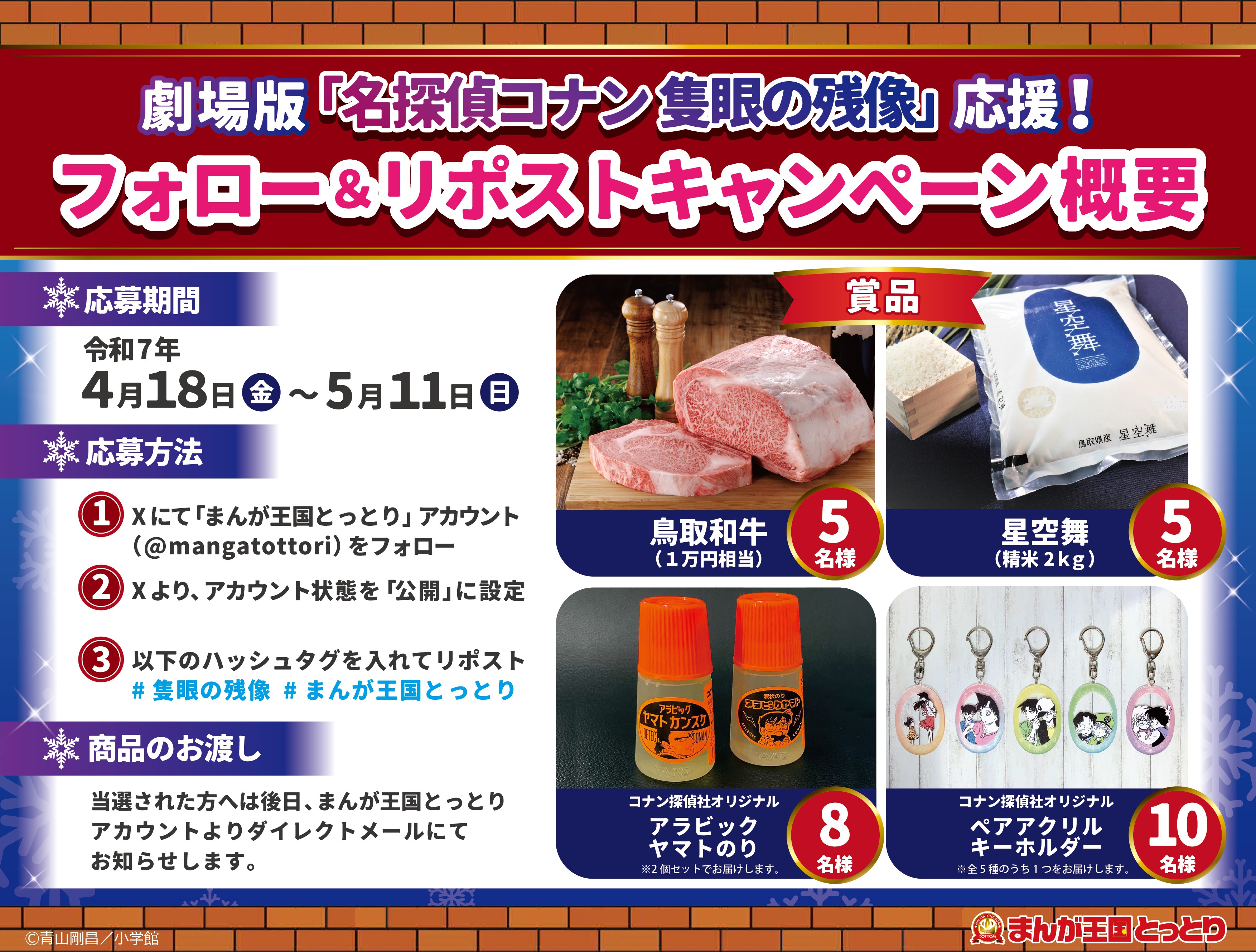 ○「まんが王国とっとり」公式Xをフォローし、同アカウントが発信する劇場版「名探偵コナン 隻眼の残像」応援(キャンペーン案内)の投稿にハッシュタグ「#隻眼の残像 #まんが王国とっとり」をつけて引用リポストすると抽選で賞品をプレゼント