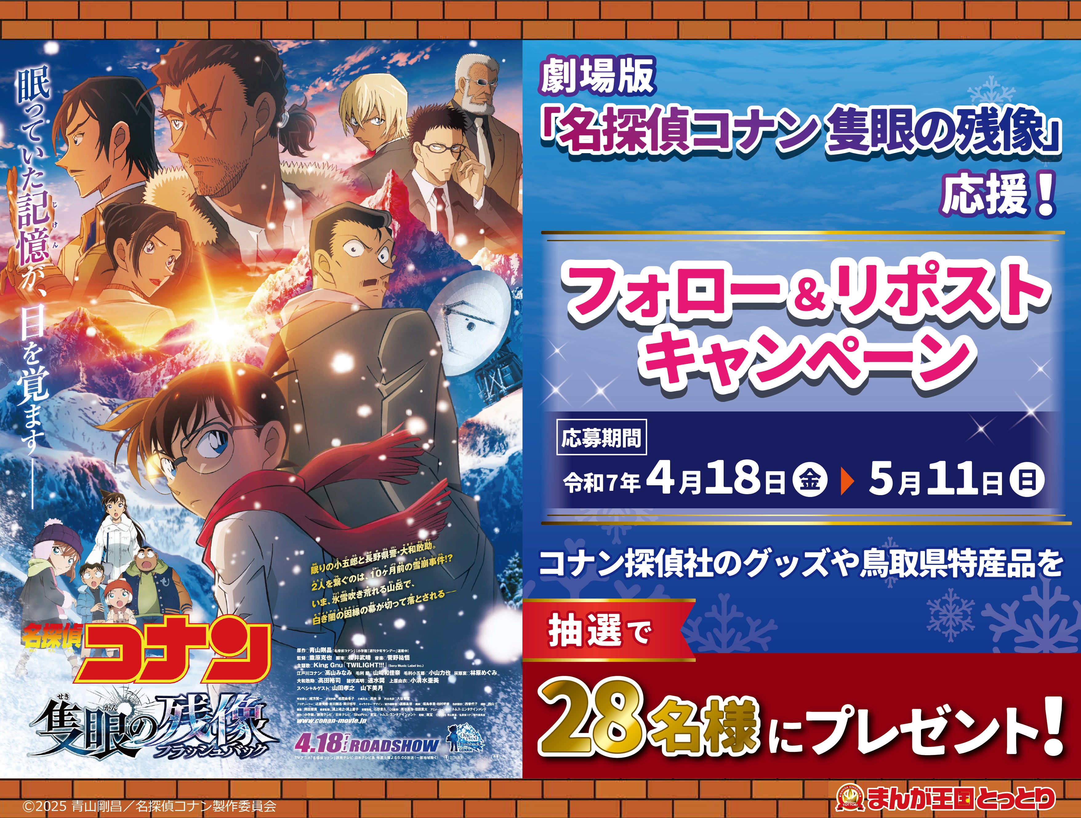 4月18日(金)に劇場版「名探偵コナン 隻眼の残像(せきがんのフラッシュバック)」が公開されます。「まんが王国とっとり」では青山剛昌先生のふるさととして映画を応援するため、下記のとおりフォロー&リポストキャンペーンを実施します。